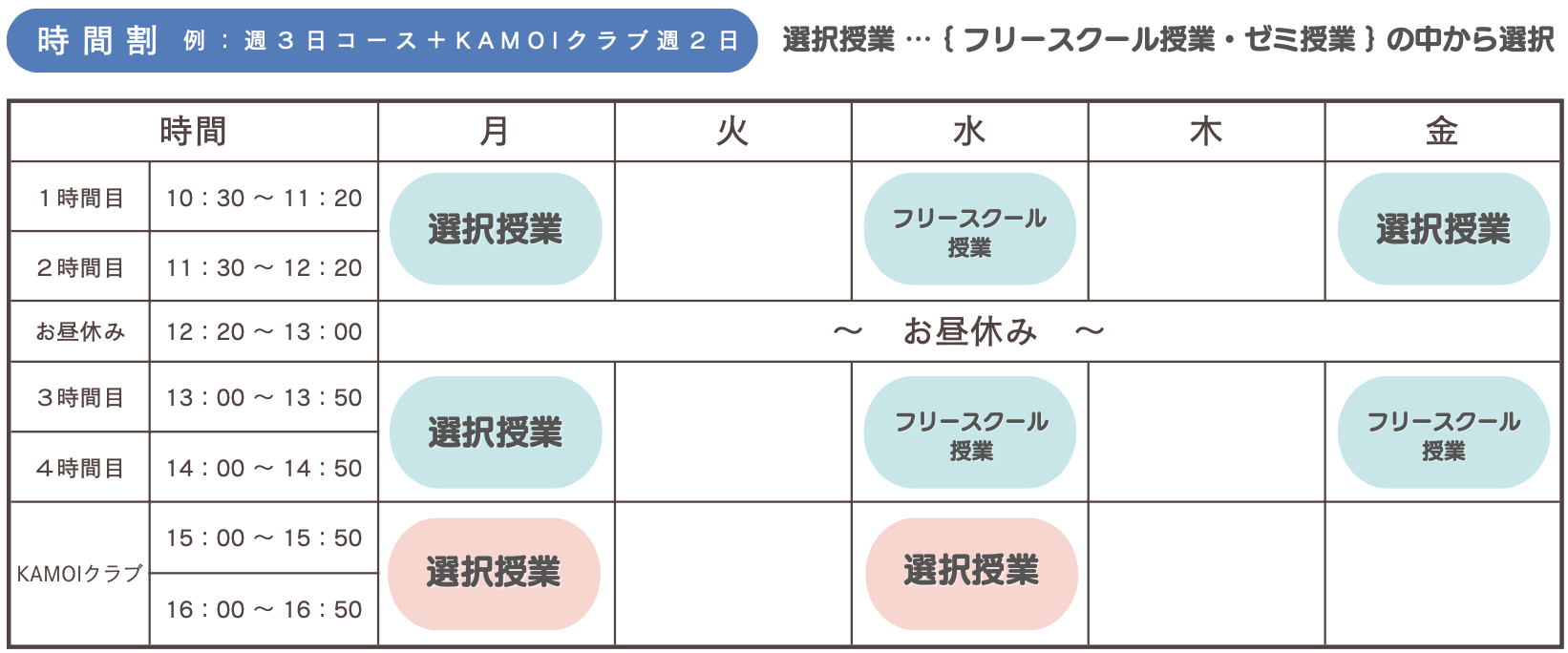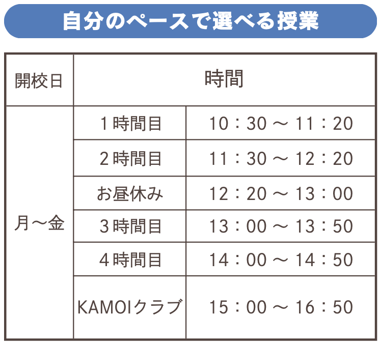 | 登校スタイル | 週5〜週1(半日も可能)の中から選択制 |
