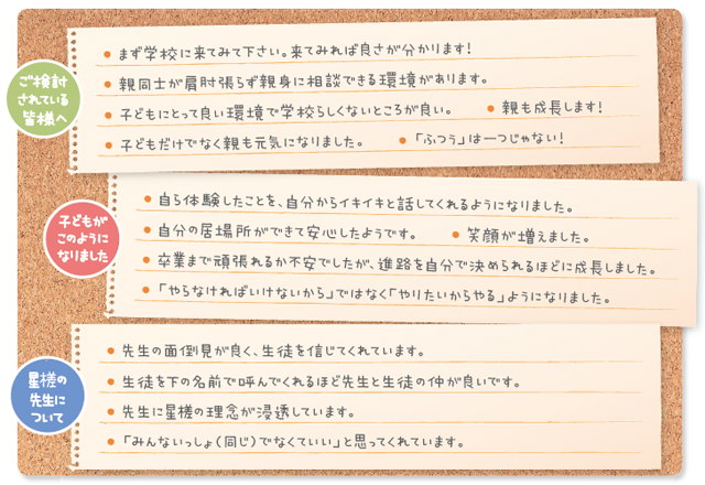 昨年度は各メディア、紙面に『星槎』の文字が多く取り上げられ、生徒達の笑顔が全国より届く度に我が子のような気持ちで周りに自慢していた年でありました。北海道から沖縄まで様々な違う環境の中、日々子供と向き合う保護者の皆様には『星槎』と言うキーワードで、これ程の仲間が居ることは、とても力強いと思います。