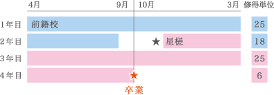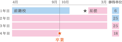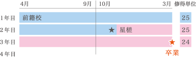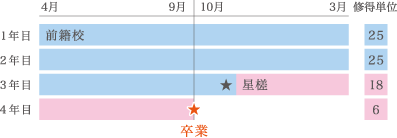 ★の時点(10月以降)から次の3月までは、6ヶ月ありません。星槎の単位認定の条件の一つ、「6ヶ月以上の在籍」を満たさないことになってしまうのです。すでに前籍校で修得済みの50単位とすると、残り必要な24単位を、2年度に分割してカリキュラムを組む形となります。