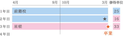 ★の時点でまだ高校に在籍していれば、★がどの時点であっても、ほとんどの場合、3年間で高校を卒業が可能です。前年度までに前籍校で認定された単位と、星槎での修得単位の合計が74単位になるようにカリキュラムを組みます。通算の高校在籍もきれいに3年間になり、学年を落とすことなく卒業できます。