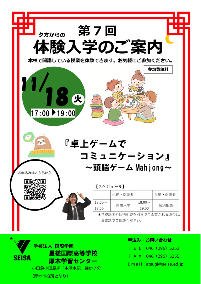 夕方からの体験入学 『卓上ゲームでコミュニケーション』 ~頭脳ゲーム Mahjong~