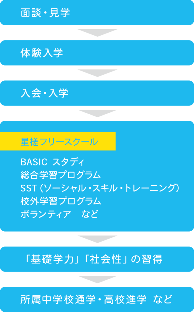『星槎フリースクール』は,さまざまな理由によって現在学校に通っていない、あるいは休みがちな小・中学生や進路模索中の若者たちのための「新しい学びの場」です。 ここでは、一人ひとりの生徒が「ゆとり」をもって「自分らしく」・「充実した」日を過ごしていくための総合的なサポートをしています。