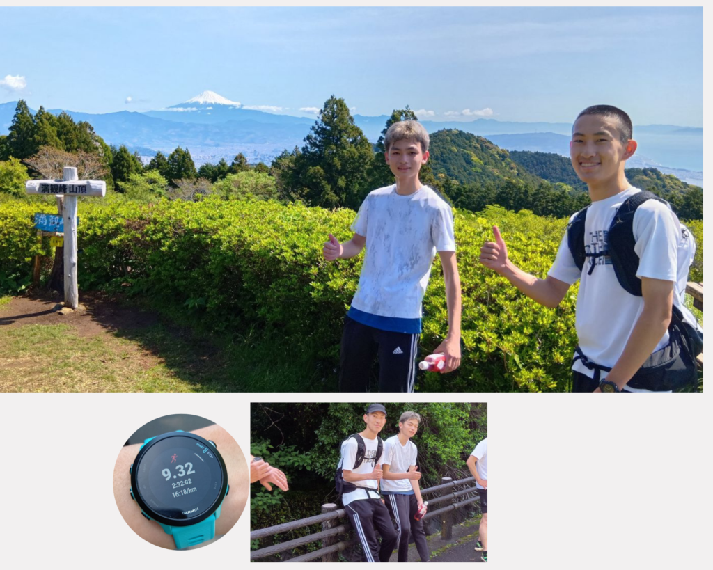 早朝、先生と共に花沢の里を出発、高草山山頂から満観峰へと山でのランニング練習を行いました。