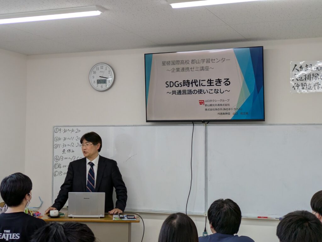 郡山学習センターでは、今年度、企業様・事業所様に、生徒が直接お話を伺う機会を設けました。第2回目は、入学式にもお越しいただきました、山口タクシーグループの山口松之進様です。