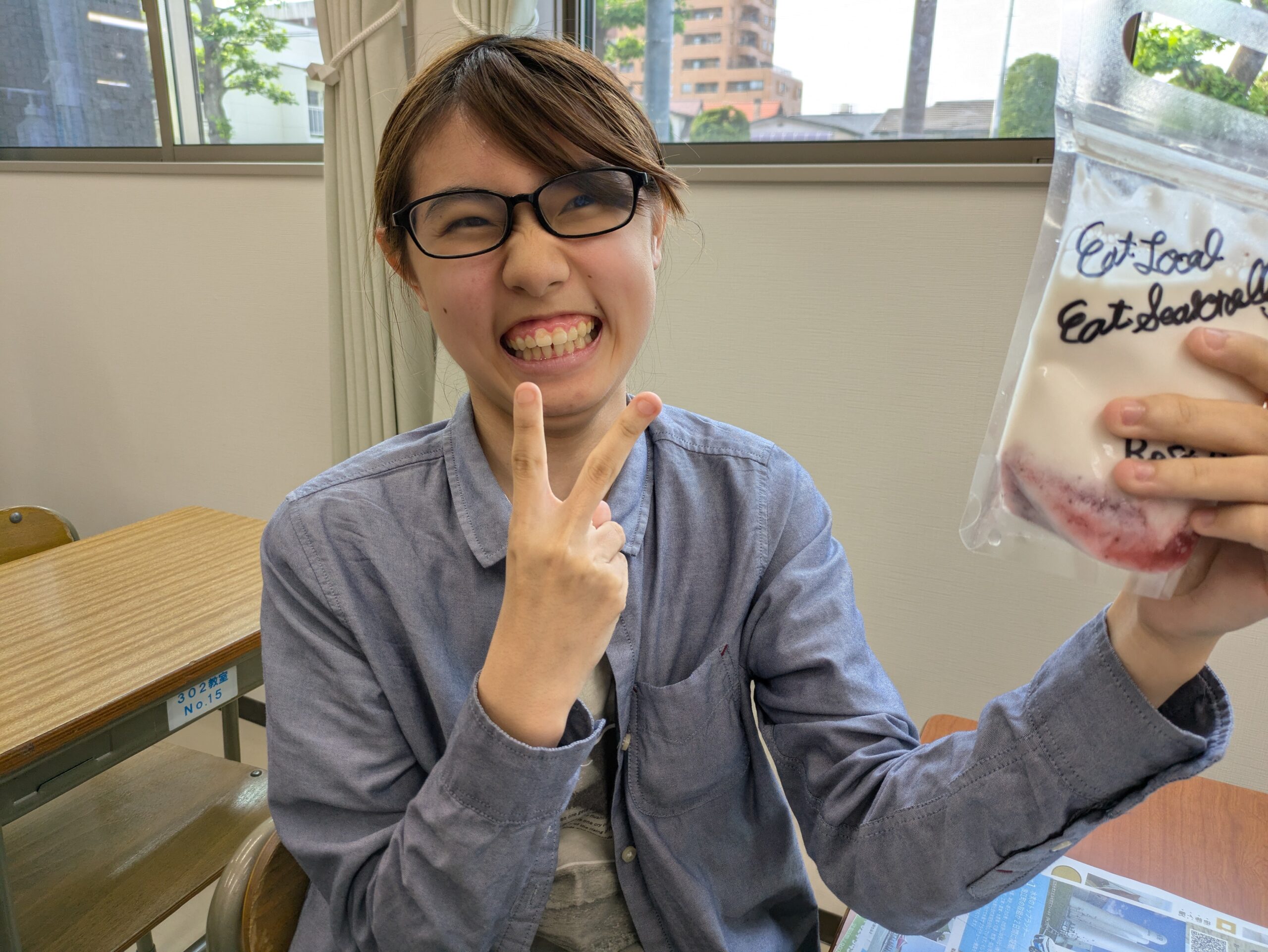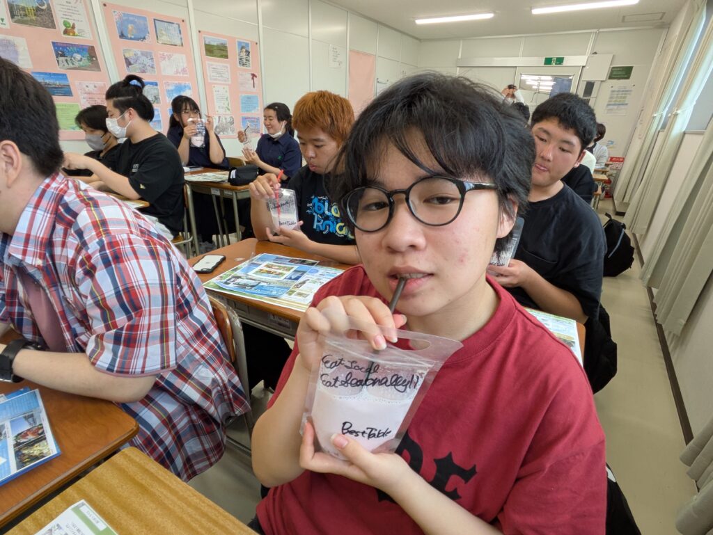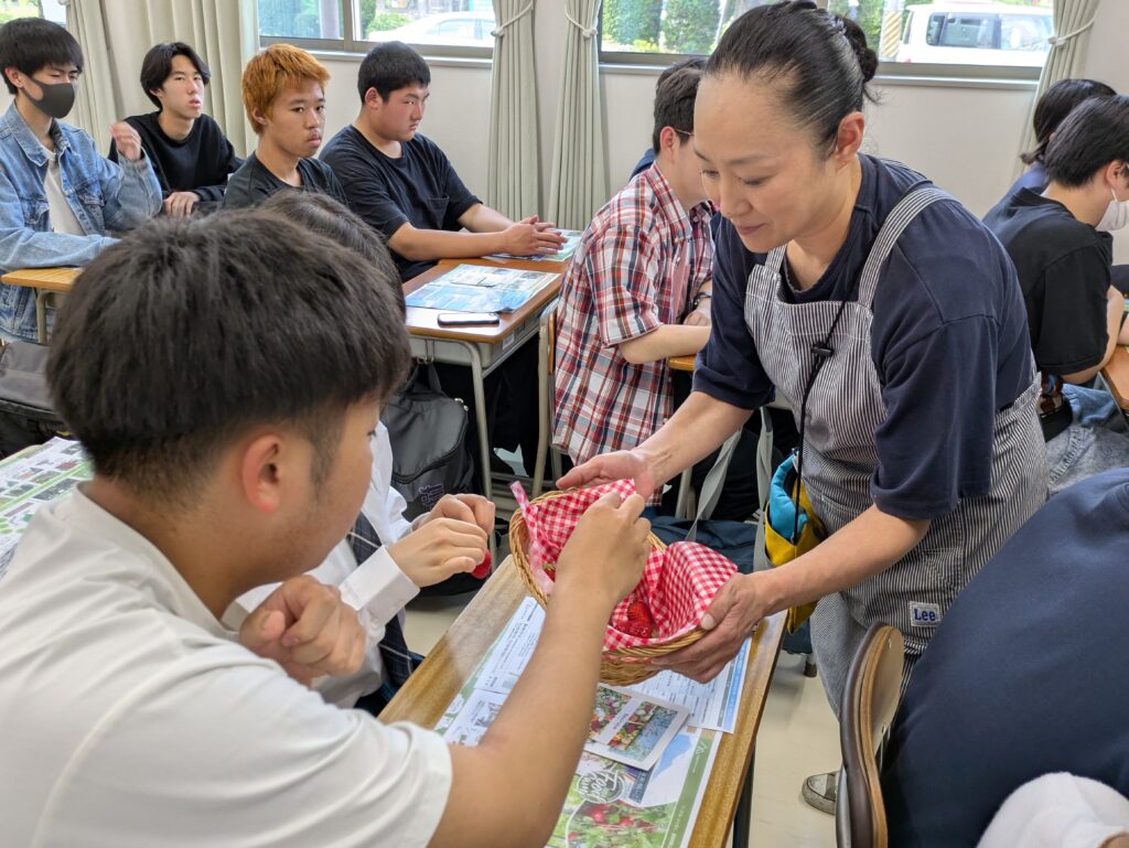 講義では、レストランBest Tableが紹介されたニュース映像なども見せていただきました。地元の人に良いと思ってもらえるようなモノやコトを作り上げていきたいという、想いが感じられるVTR。そして、同じ想いを持たれている生産者さんと一緒に開催する農園レストラン。ここでしかできない、素敵な体験ができるのがとても素晴らしいな・・・。と思いました。レストランでは、二十四節気に合わせた旬の食材を取り入れていること。震災・原発事故で被災した市町村の食材をふんだんに使っていることなど、企業として熱意のある取り組みをされています。そして、何よりもお客様に喜んでもらえることを大切にされていることが良くわかるお話しでした。最後には、なんと「いちごミルク」のプレゼントまでいただいてしまいました。生徒達、大喜びです。