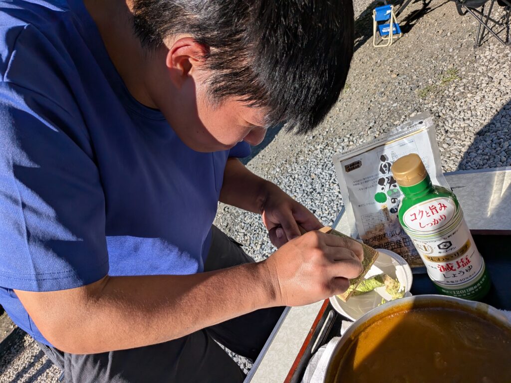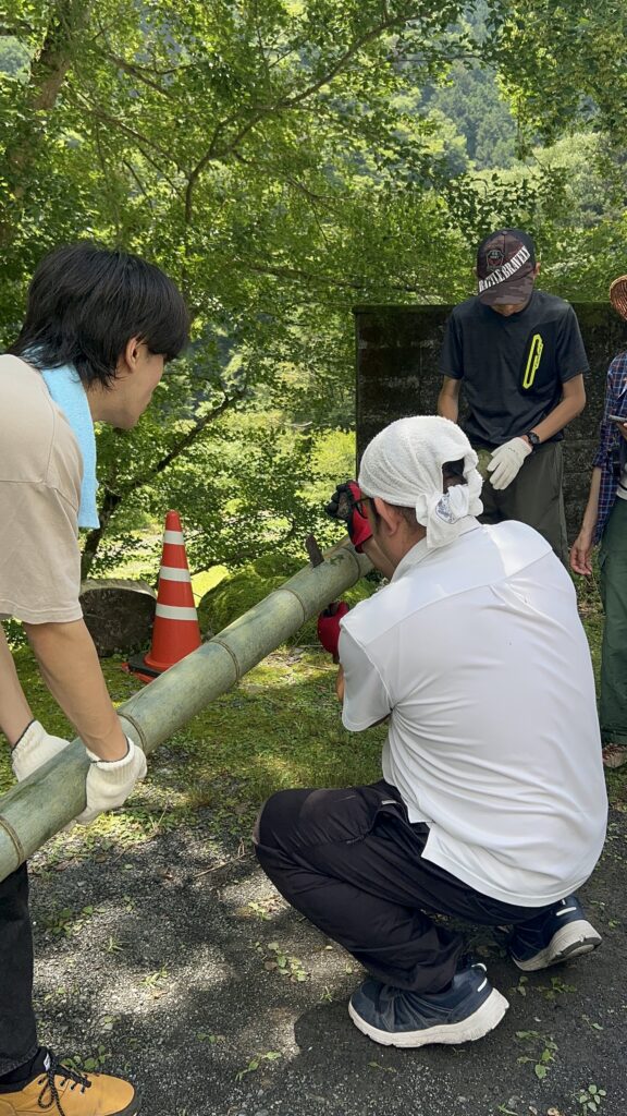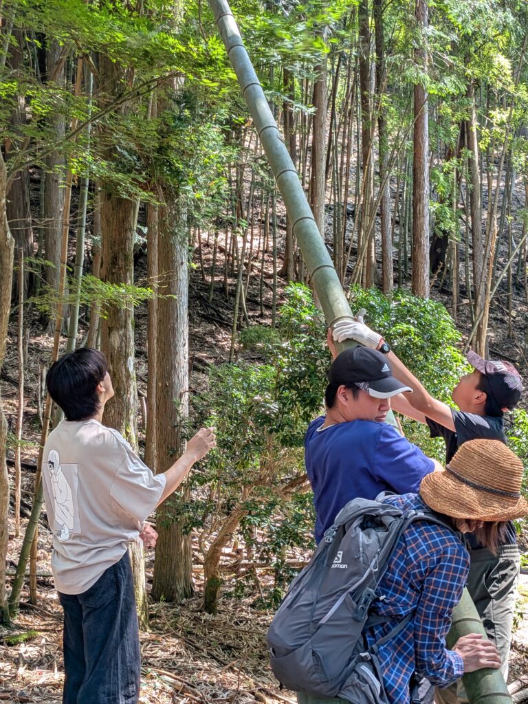 朝は7時30分に集合し、9時にはキャンプ地に到着。最初のミッションは昼食づくりで、流しそうめんをイチから準備します。ということで竹を伐採に😁