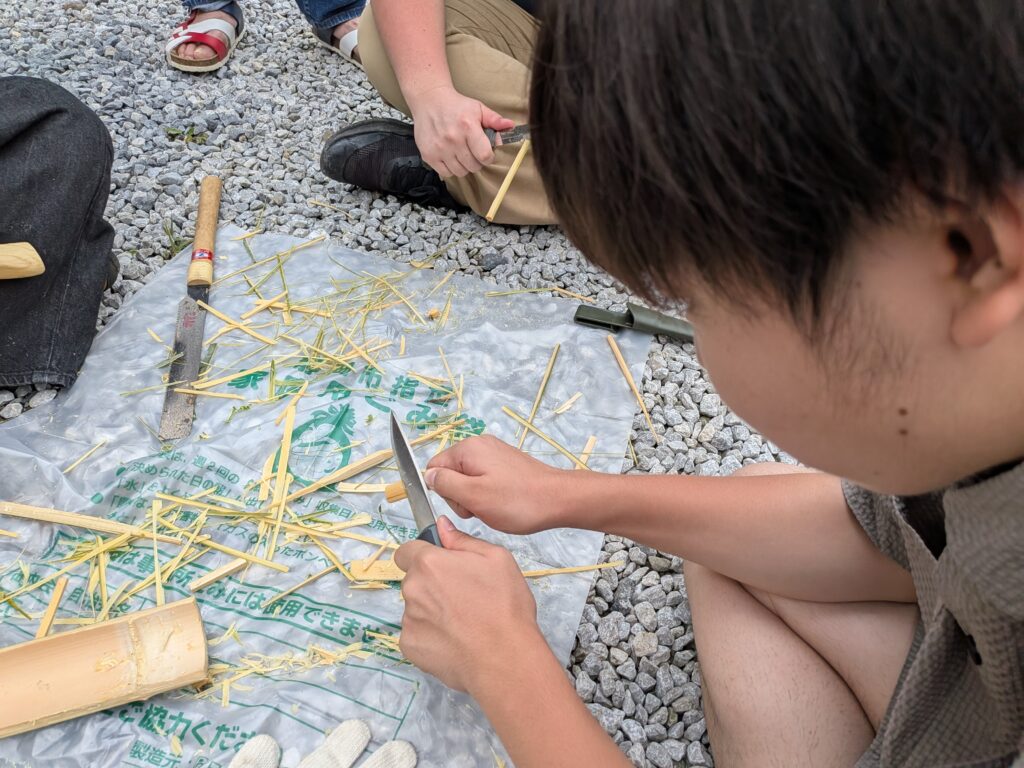 キャンプ地に戻ったら竹を加工!慣れれば扱いやすい材料ということも知れました👌