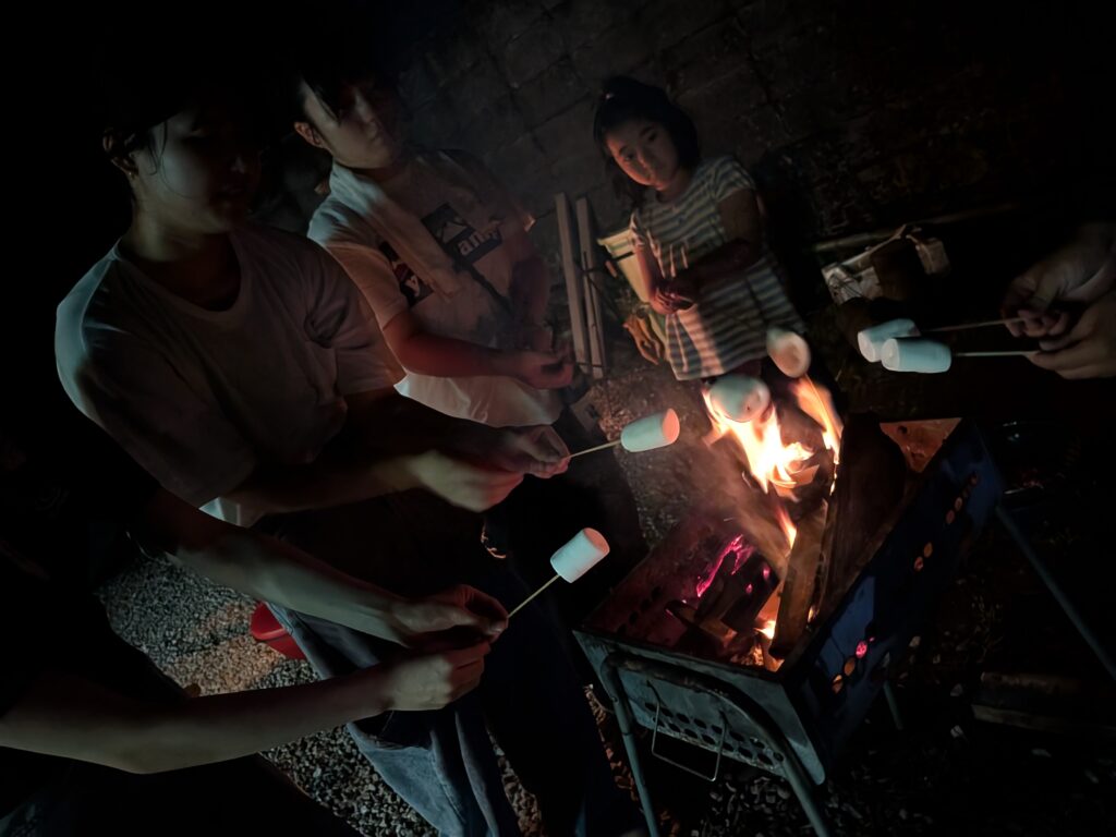 夜はそれぞれに過ごし、卓球をする者、火を見つめながら語り合う者、温泉を満喫する者、カラオケをする者、虫を取りにいく者。