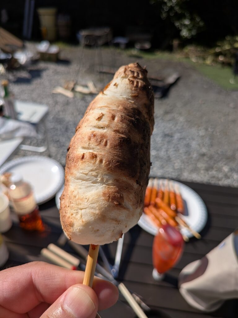 朝まで冷蔵庫でゆっくり発酵させ、ソーセージに巻き巻き😁炭火でじっくり焼いて程なく完成!
