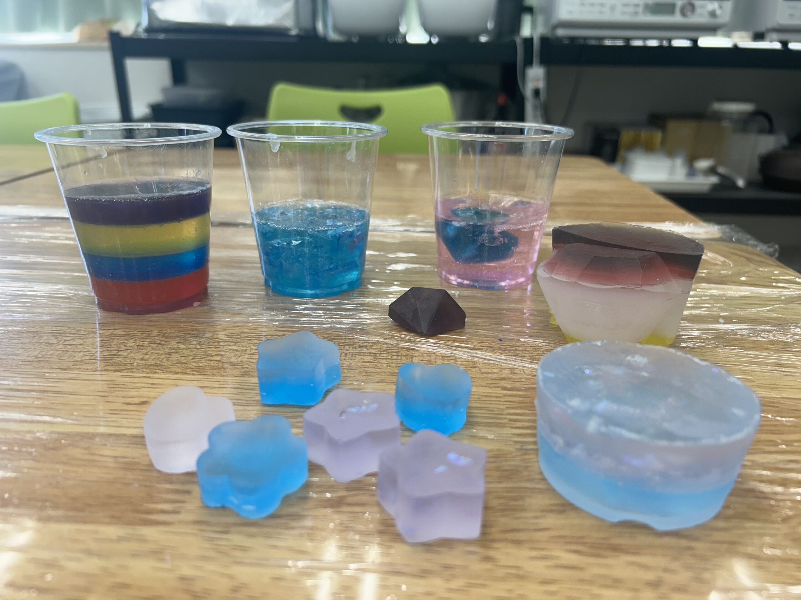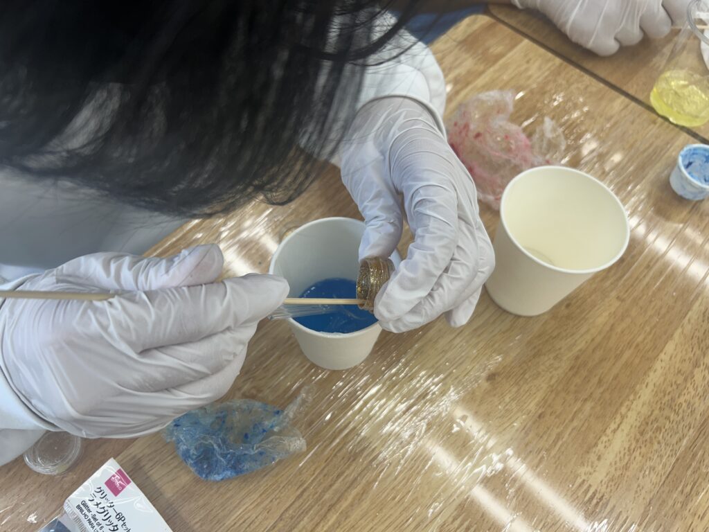 想像通りの色にならなくても、発色が美しく、創り出した色の方が正解!型に入れたり、キラキラを入れたり夢中で作り、満足のいく作品が出来上がりました!