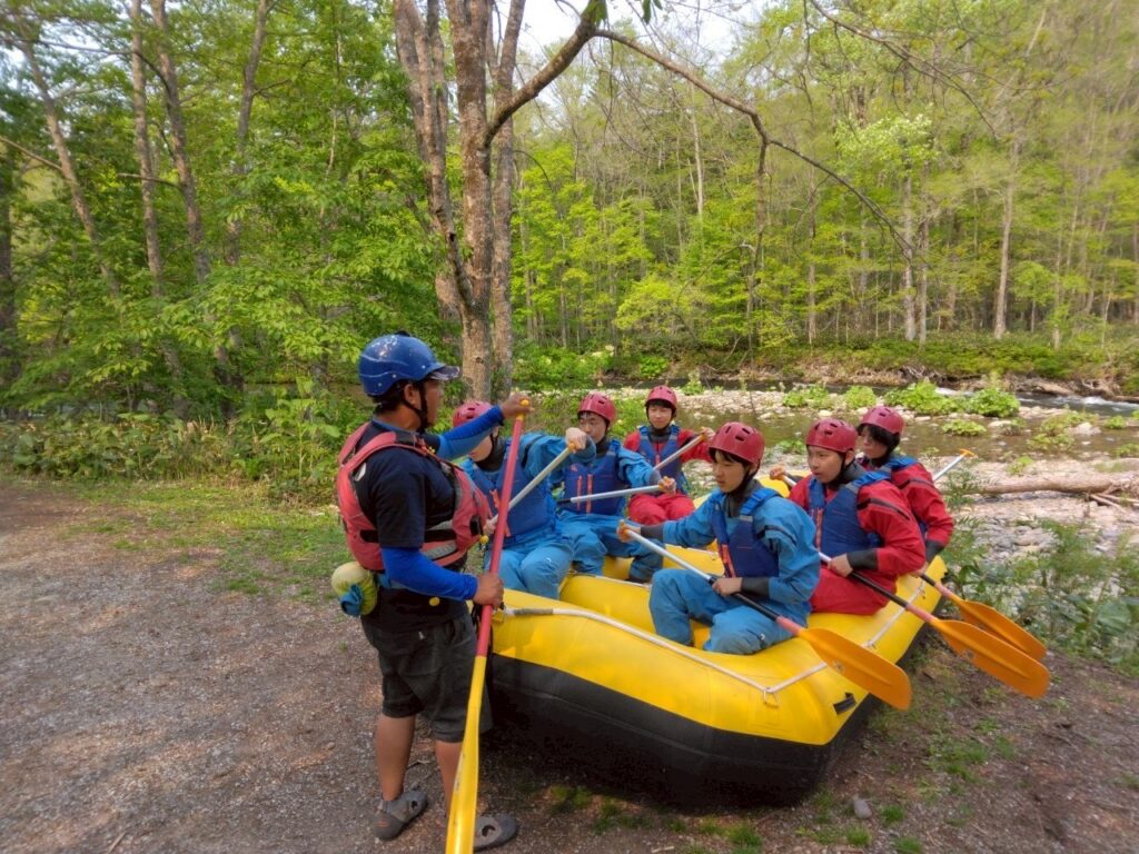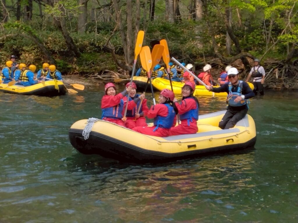 インストラクターさんのお話をきちんと聞いて、ルールを守ってドライスーツを着てラフティングに臨みました。インストラクターさんと一緒にパドルを掲げてテンションをあげて、チーム一丸となり川を下ってきました!