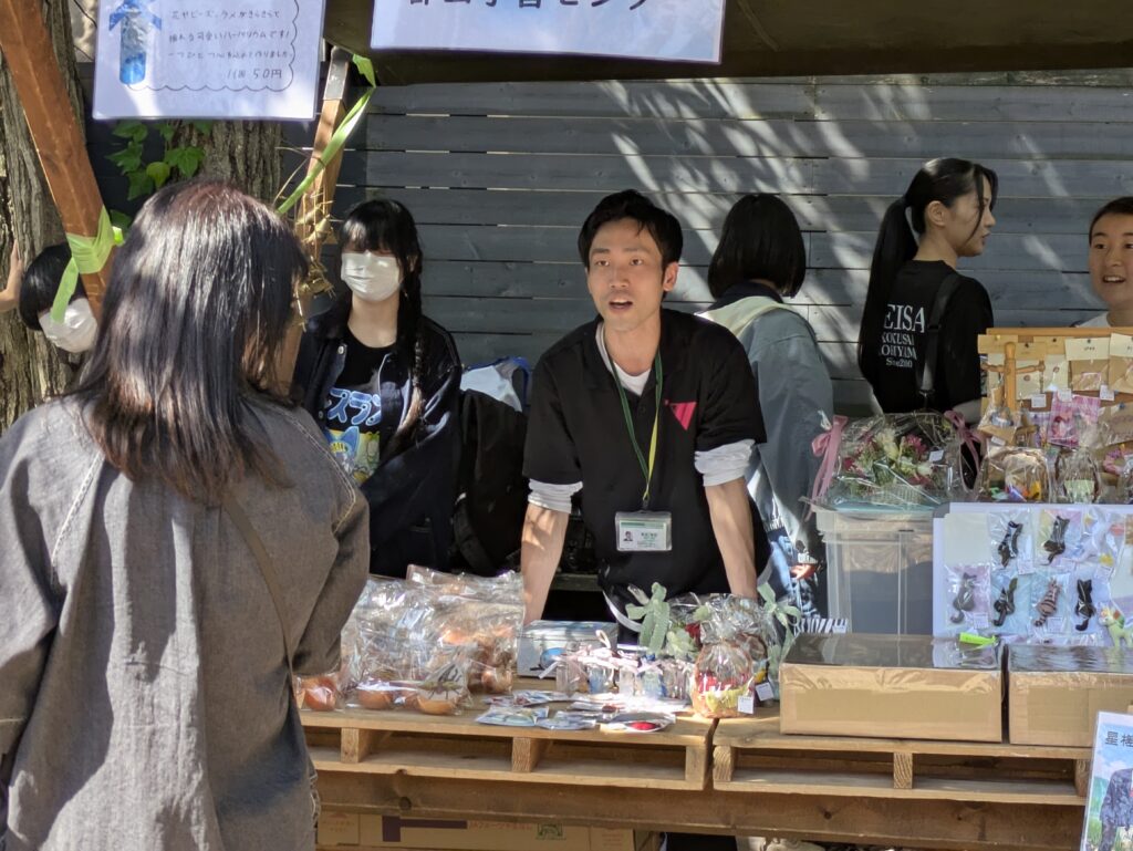 この日は、農業ゼミが栽培したタマネギの販売、ハンドメイドゼミが制作した小物販売、地域共生ゼミが作った笹巻き(きなこじゃなくて、カフェオレ味!)の試食を配布しました。