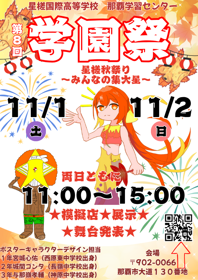 【星槎国際那覇】2025学園祭「星槎秋祭り~みんなの集大星☆~」のお知らせ 2025.10.29 星槎国際那覇 11月1日(土)、2日(日)の2日間、那覇学習センター2025学園祭「星槎秋祭り~みんなの集大星☆~」を開催いたします☺ 日頃の学習成果を模擬店、ステージ、体験・販売、掲示などで発表します! 同時開催のオープンスクールでは、在校生の案内で学園祭ツアーを実施しますので、ぜひお気軽にお問い合わせください♪ お申込みはこちらから👉お申込フォーム