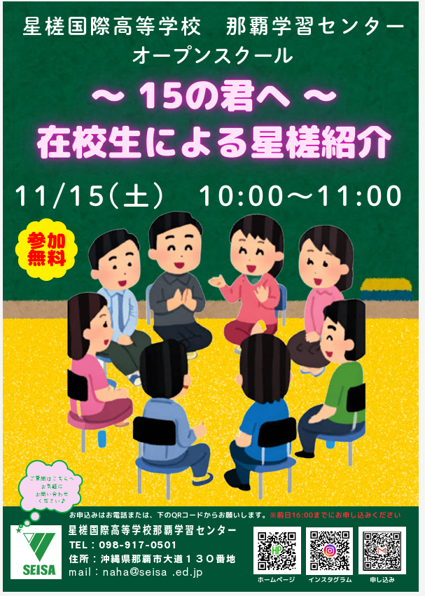 【星槎国際那覇】11月オープンスクール「15の君へ」在校生による星槎紹介✨ 2025.10.29 星槎国際那覇 11月オープンスクールは毎年好評!在校生による星槎紹介☆ ・星槎ってどういう学校? ・どんな授業するの? ・生徒や先生たちはどんな雰囲気? などなど、在校生目線で分かりやすくご紹介します♪ ご参加お待ちしています♪ お申込みはこちらから👉お申込フォーム