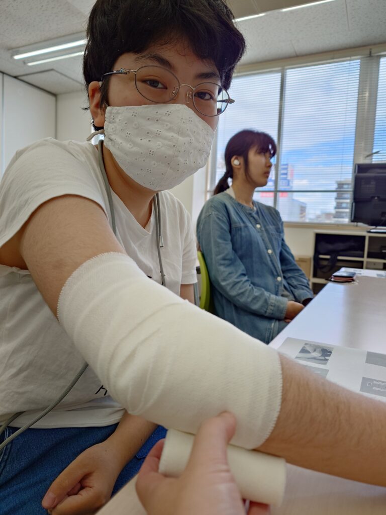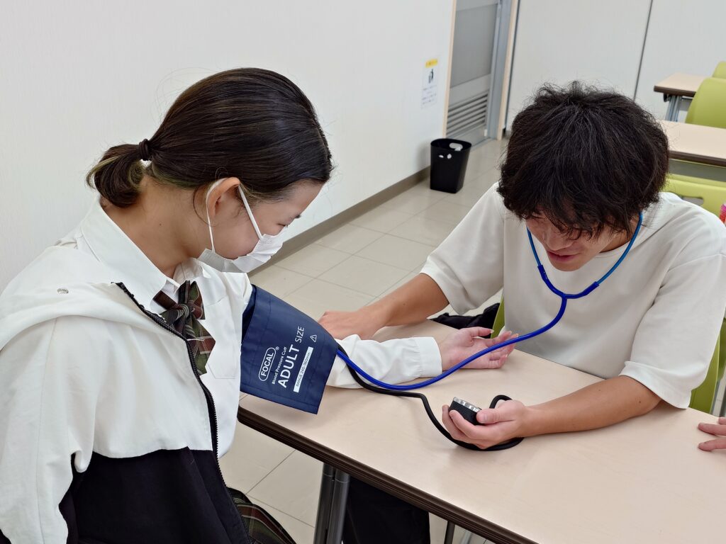 普段の授業の様子がこちら。血圧の測定方法や包帯を巻く方法などを学んでいます。
