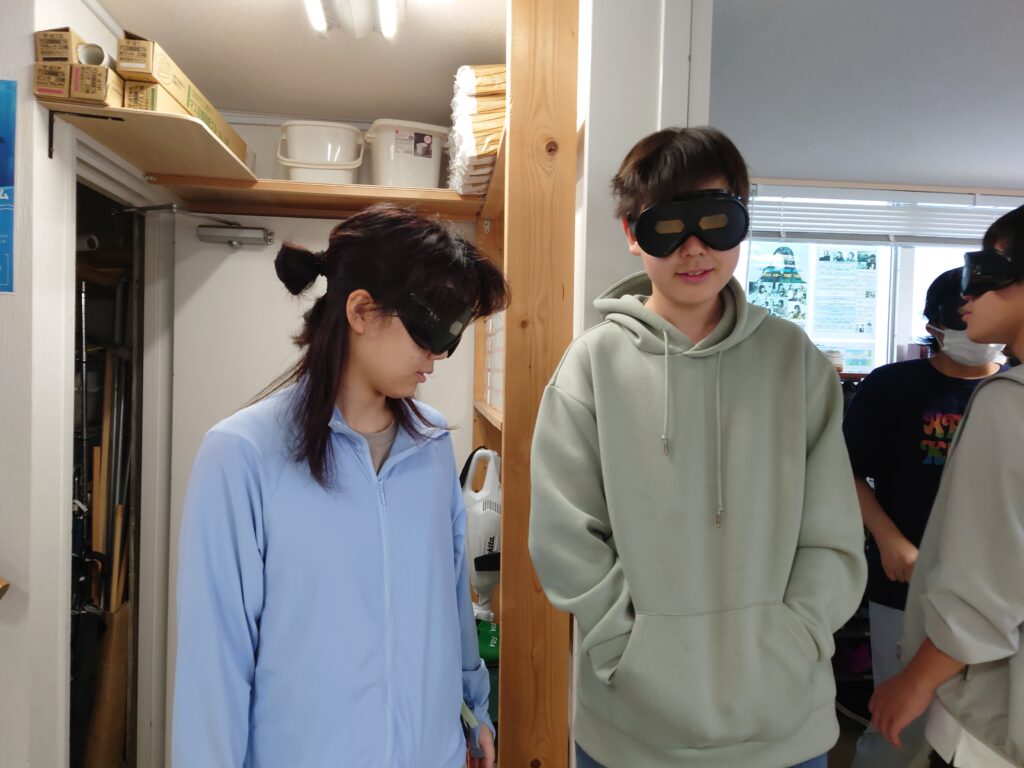 授業の様子がこちら。授業内で、座学のほか、ゴーグルを付けて校舎内を巡るなど体験を行いました。