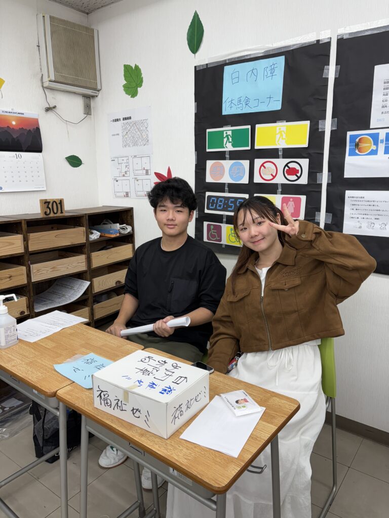 続いて、福祉ゼミ。文化祭では、来場者にゴーグルをつけてもらい、白内障体験を行いました!白内障の方が見えている視界を体験していただきました。