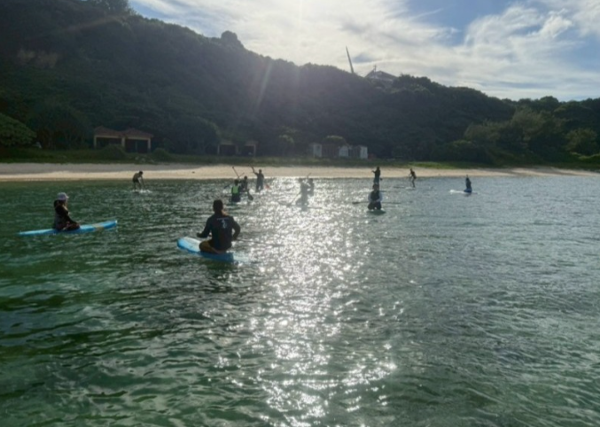 SUP(スタンドアップパドルボード)体験では、最初は不安もありましたが、仲間と声を掛け合いながら挑戦し、次第に立てるように。