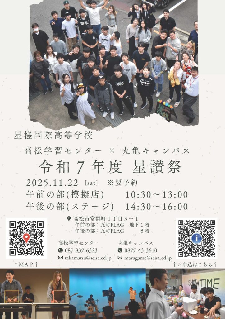 星讃祭!11月22日(土)開催予定! 2025.11.13 星槎国際高松, 星槎丸亀キャンパス 11月22日土曜日、瓦町フラッグにて、高松丸亀合同の文化祭、星讃祭がおこなわれます。 午前10時30分より地下1階のキッチンスタジオのファンタジオで模擬店、午後2時半より8階のアートステーションでステージ発表をおこないます。見学をご希望の方は、以下チラシのQRコードより、ご予約願います!お待ちしています。