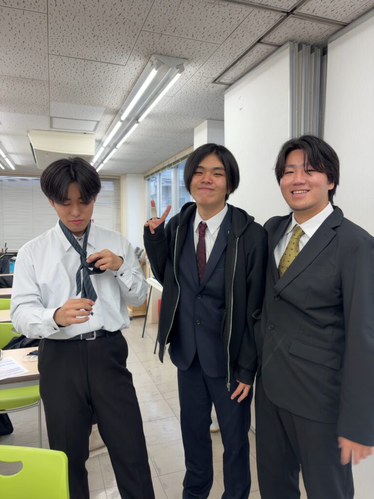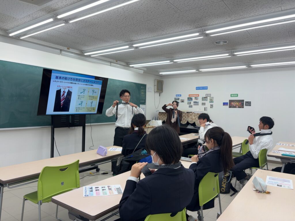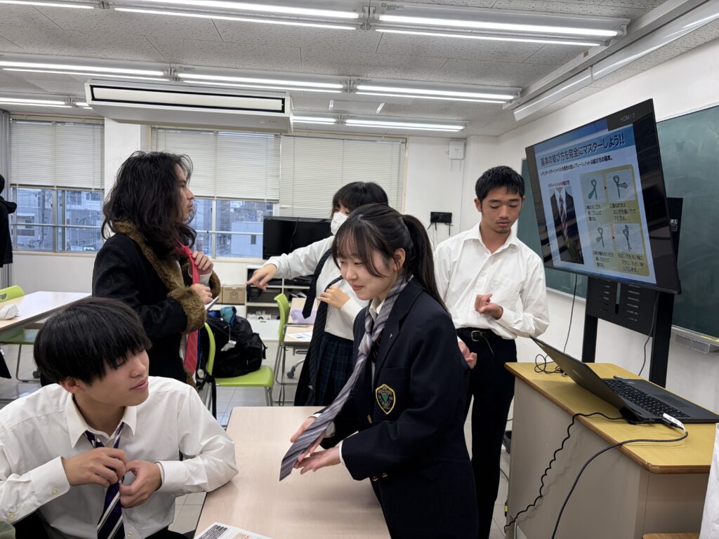 そして、ネクタイの結び方にも全員で挑戦!スタッフの方が丁寧に教えてくださり、最初は苦戦していた生徒たちも少しずつ上手に結べるようになりました。さらに友達同士で教え合いながら練習する姿も見られ、3年生らしい優しさがあふれる時間となりました。