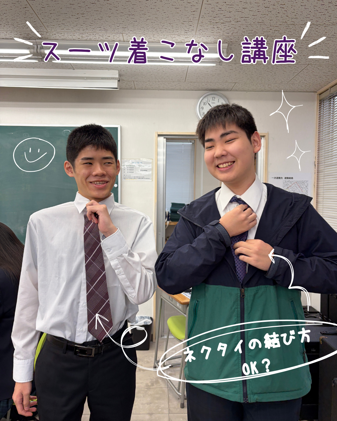 そして、ネクタイの結び方にも全員で挑戦!スタッフの方が丁寧に教えてくださり、最初は苦戦していた生徒たちも少しずつ上手に結べるようになりました。さらに友達同士で教え合いながら練習する姿も見られ、3年生らしい優しさがあふれる時間となりました。