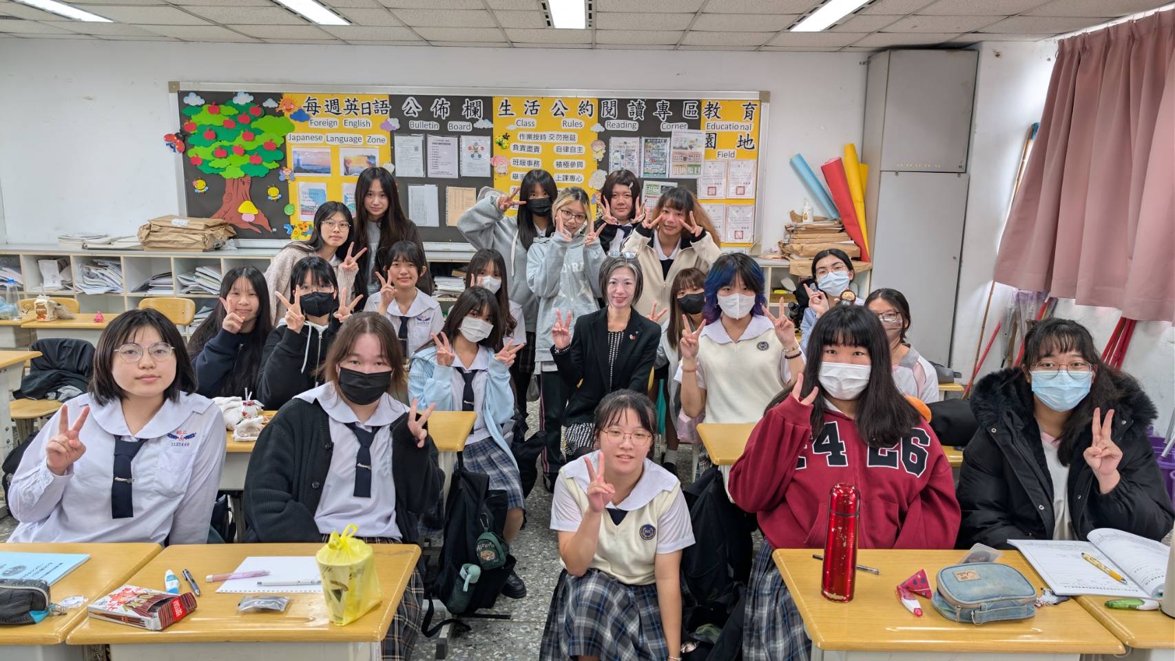 交流校である私立稲江高級護理家事職業学校(専門コースがある高等学校を訪問し、1年生2クラスと3年生2クラスで初めて授業を担当させていただきました。