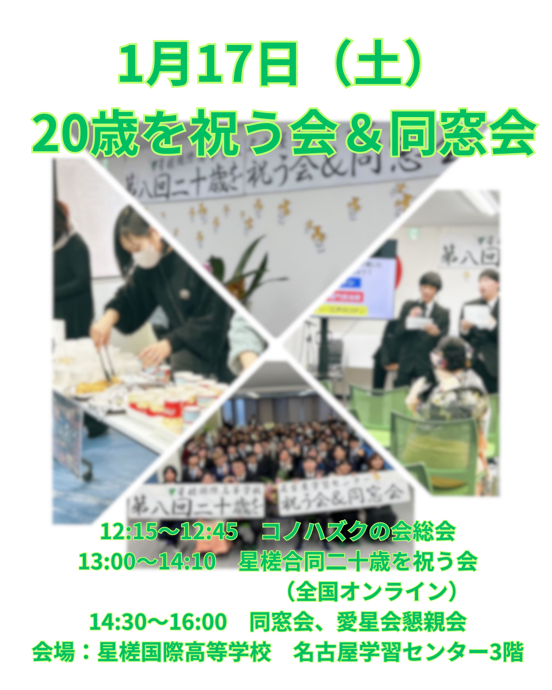 《今年もやります!20歳を祝う会㊗️》 2026.01.14 星槎国際名古屋 年が明け寒さが本格的になってきましたが…今年もやります。『20歳を祝う会&同窓会』! いよいよ今週の土曜日となりました😳✨専攻科を中心に絶賛準備中!卒業したみなさんと久しぶりに会えるのを楽しみにしています!! 20歳を祝う会についての、ご質問などは学校までお問い合わせください! では!土曜日に🔥みんなで楽しい一時を過ごしましょう🙌🏻 #星槎#星槎国際高等学校#通信制高校#名古屋#星槎国際名古屋