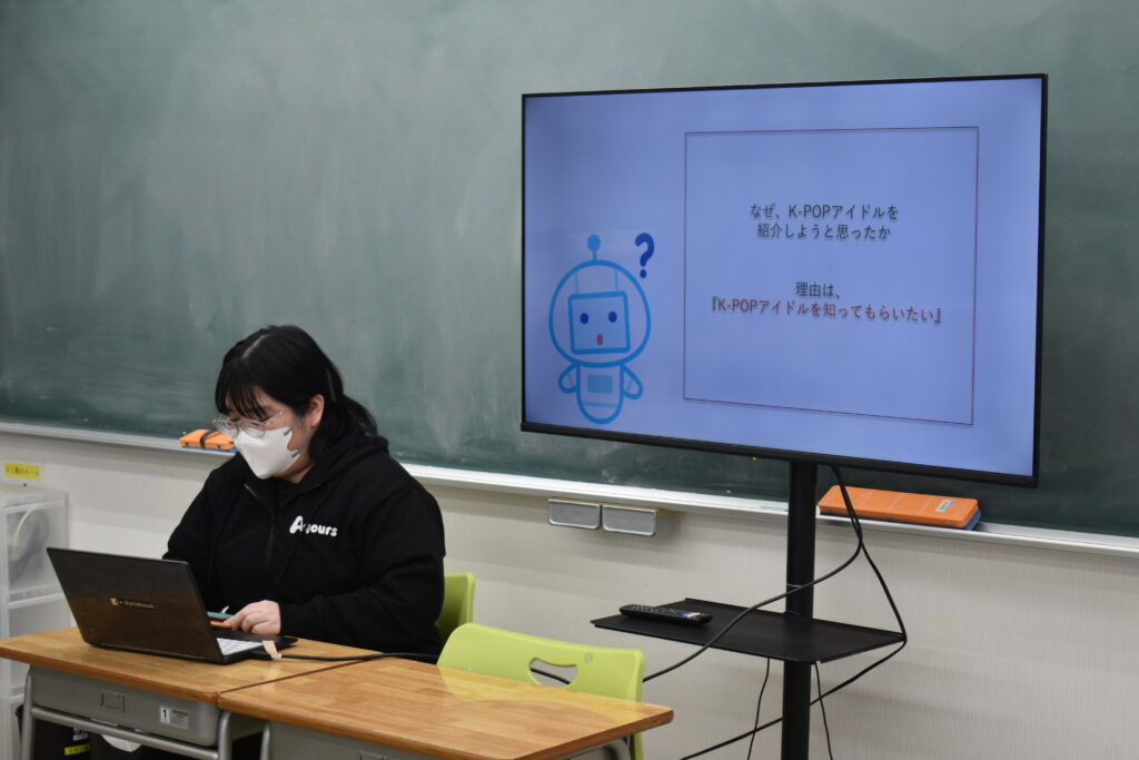韓国の食文化を調べ、日韓のマナーの違いや、赤唐辛子の伝来の歴史などを発表した生徒や、K-POP文化について調べ、韓国アイドルの活動について発表した生徒も。