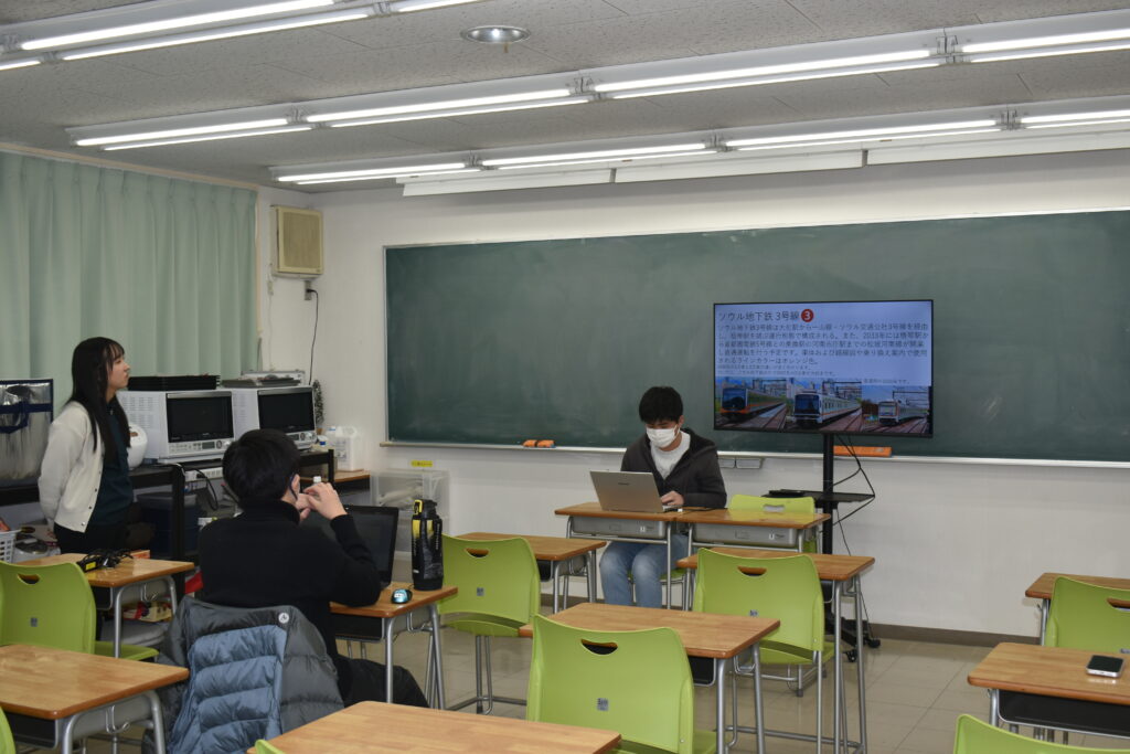 韓国の鉄道について、路線や列車が走る動画などを詳細に調べた生徒。なんとスライド30枚超え!
