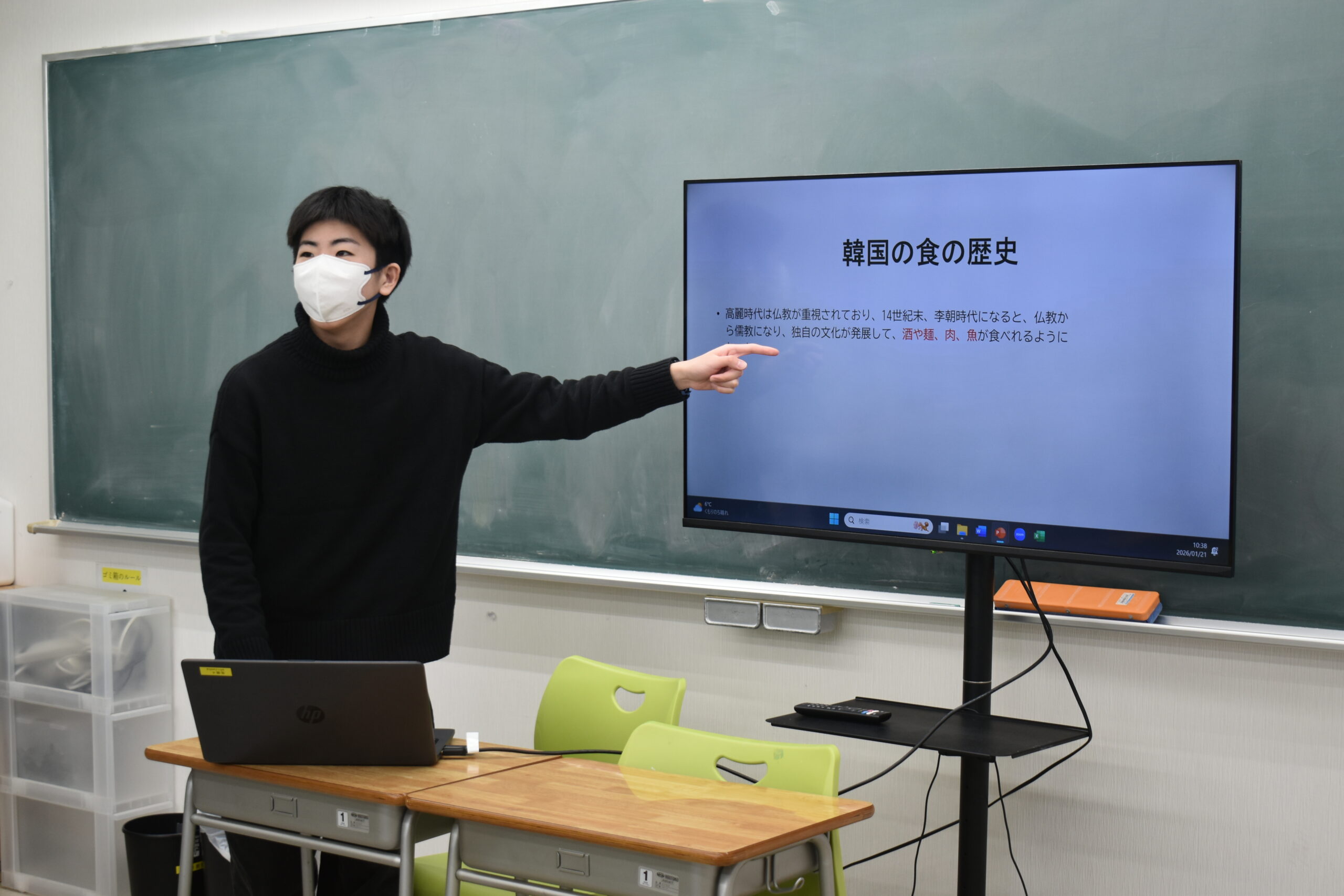 韓国の食文化を調べ、日韓のマナーの違いや、赤唐辛子の伝来の歴史などを発表した生徒や、K-POP文化について調べ、韓国アイドルの活動について発表した生徒も。