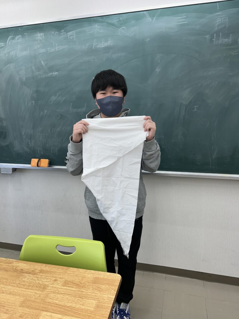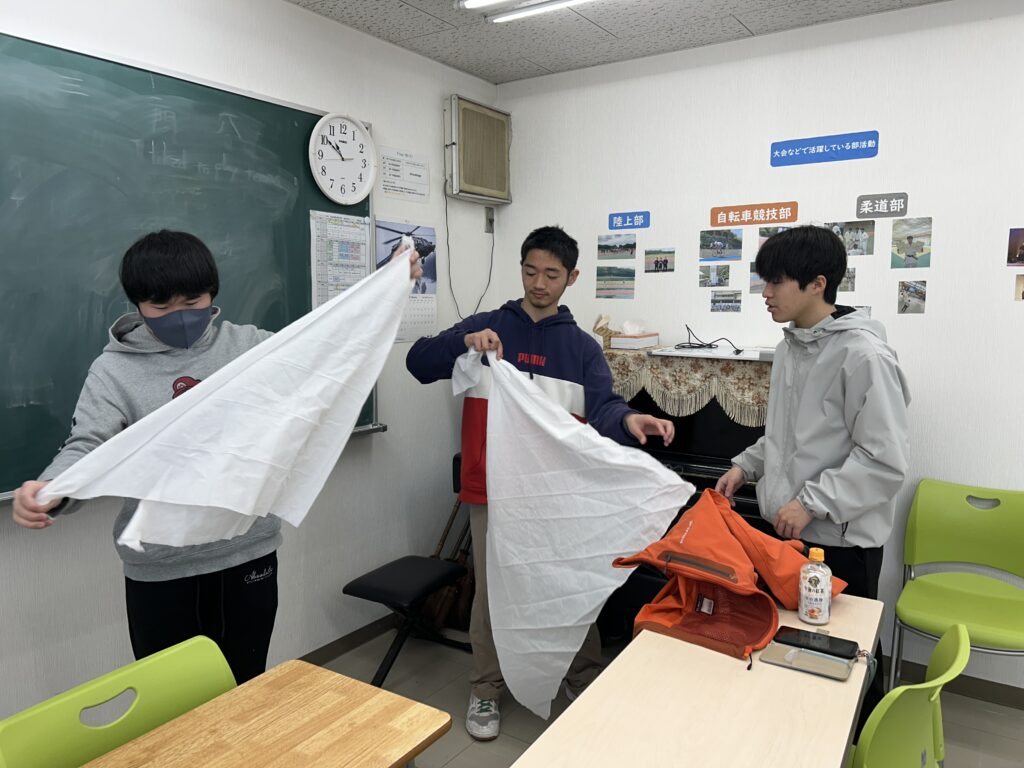 いつでも応急処置ができるよう、これまで三角巾の使い方を学んできた生徒達。