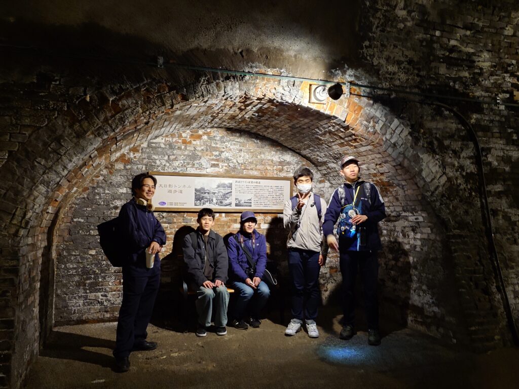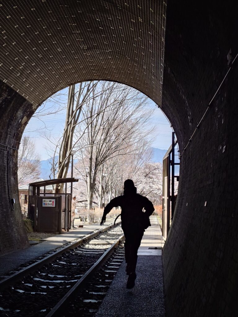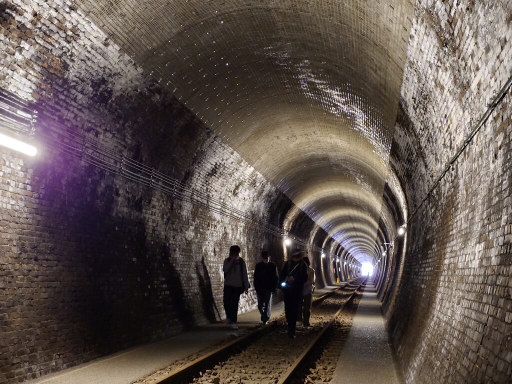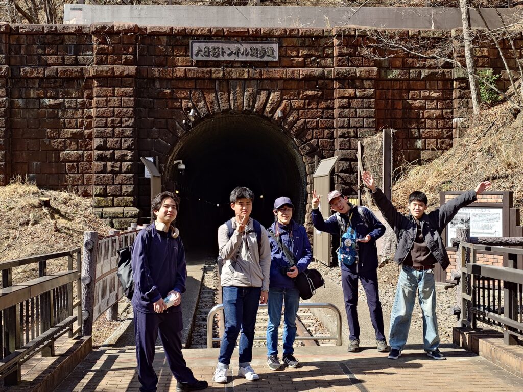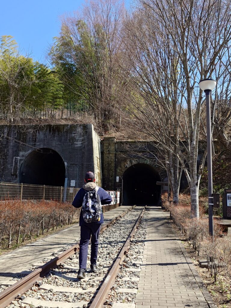 甲府駅から少し移動し、勝沼ぶどう郷駅にある旧大日影トンネルにも行ってみました。線路の残った全長1.4メートルの長いトンネルを歩くことができ、全員大はしゃぎです。