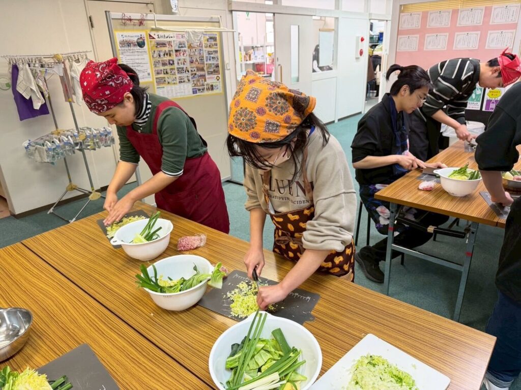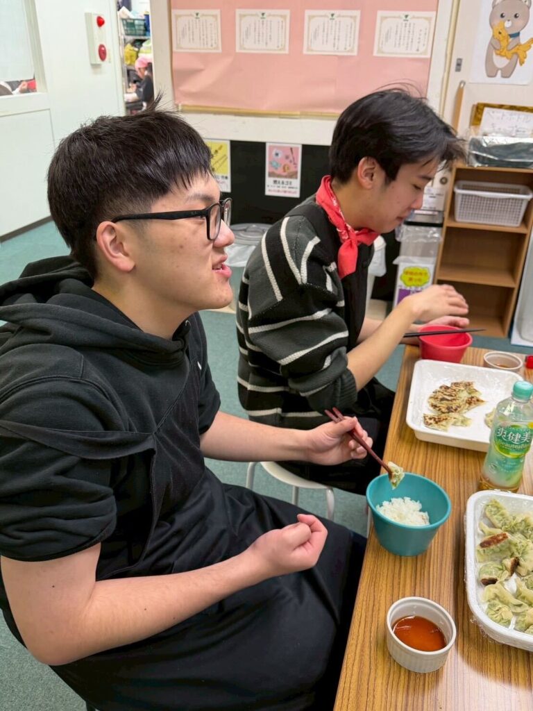 大人気企画!プロの技直伝ギョーザ作り!!餡から自分で作ります!!包丁を使ったことがないという人もいっしょにがんばりました💪できあがったギョーザはみんなでおいしく食べました😋お腹いっぱい!