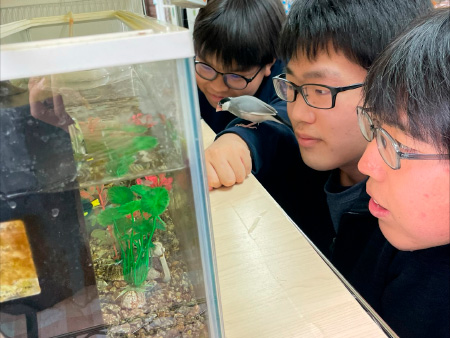 校内にいる文鳥、金魚、めだか、コリドラスのお世話をしています。