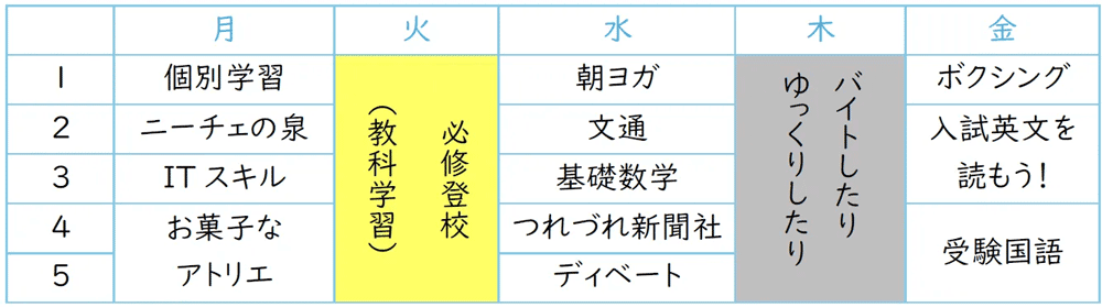 それ以外の登校日は自分で自由に登校日と授業を選択することができます。