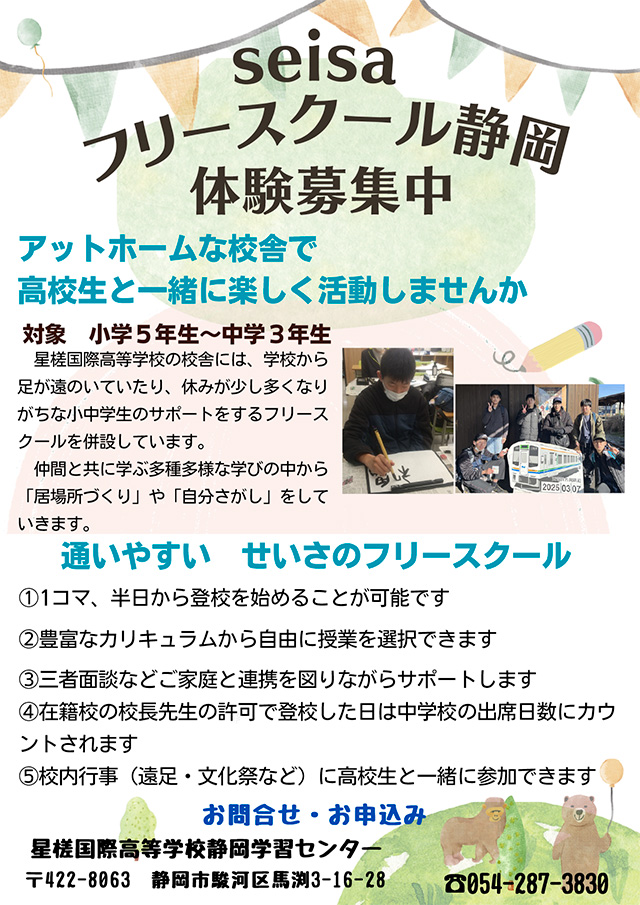 小学校5年〜中学校3年 対象 Seisaフリースクール静岡 体験募集中