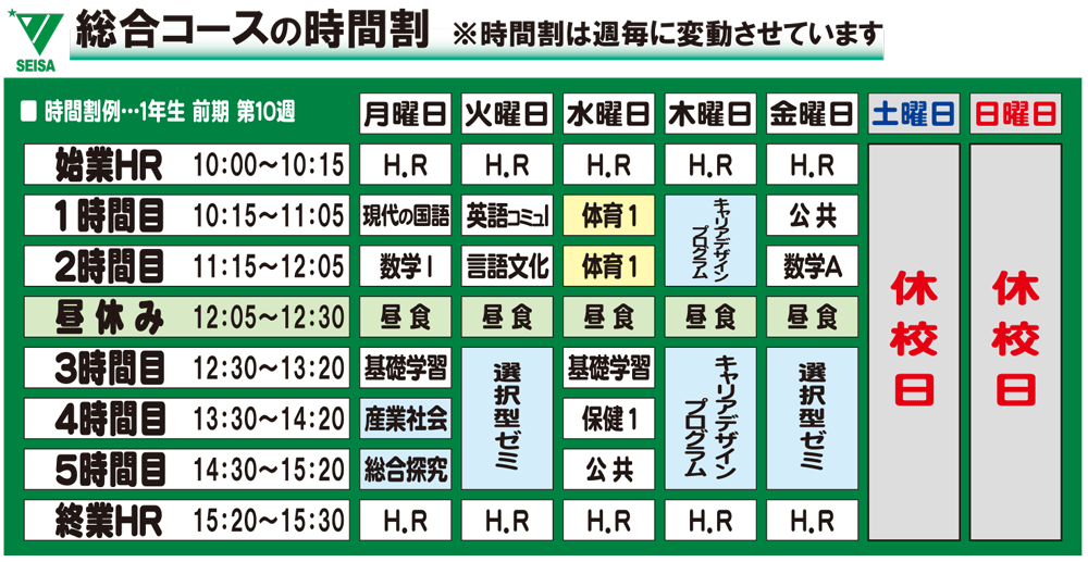 ・「総合コース」では全履修単位74単位中に20単位組み込んでいる専門教科を、すべて普通教科に組み替え、高校卒業後の進学を意識した「普通教科重視のカリキュラム」を編成してることが大きな特徴です。